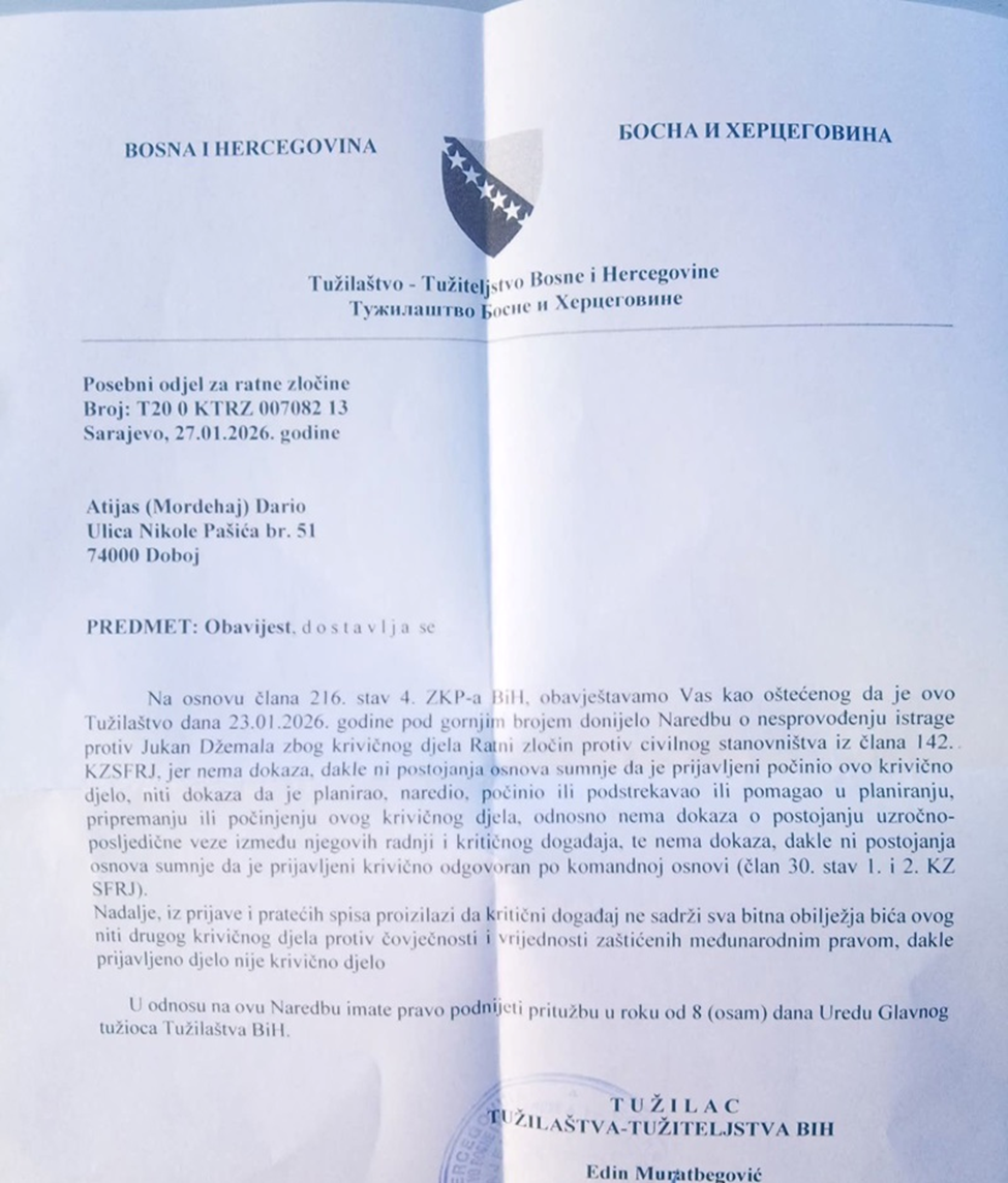 Posebno Odjeljenje za ratni zločin Tužilaštva BiH je u dopisu od 27. januara, obavijestilo Atijasa da je 23. januara donesena naredba o nesproveđenju istrage protiv Jukana Džemala zbog krivičnog djela ratni zločin protiv civilnog stanovništva.
